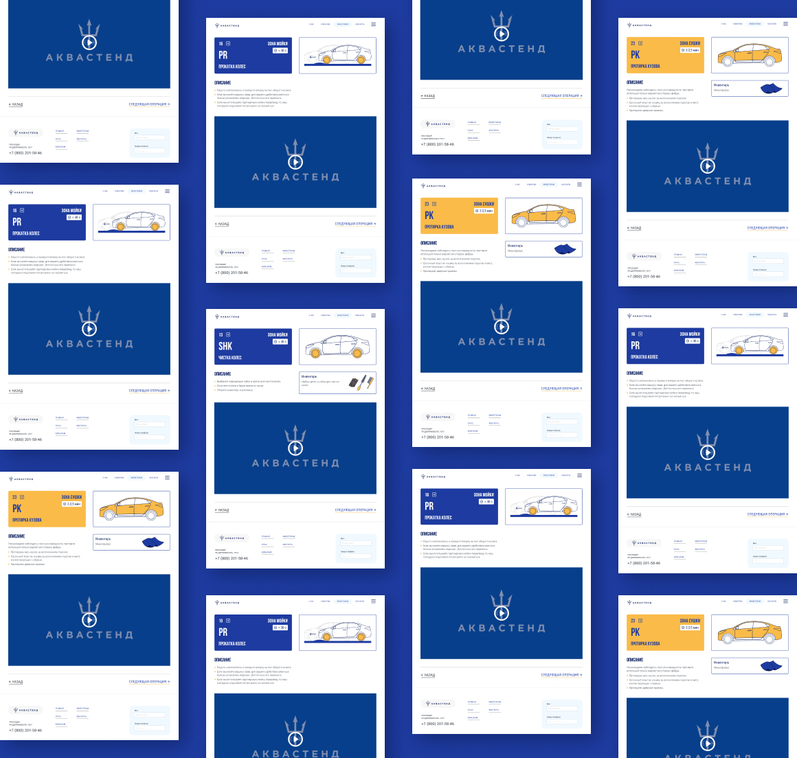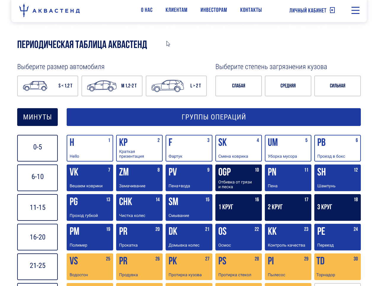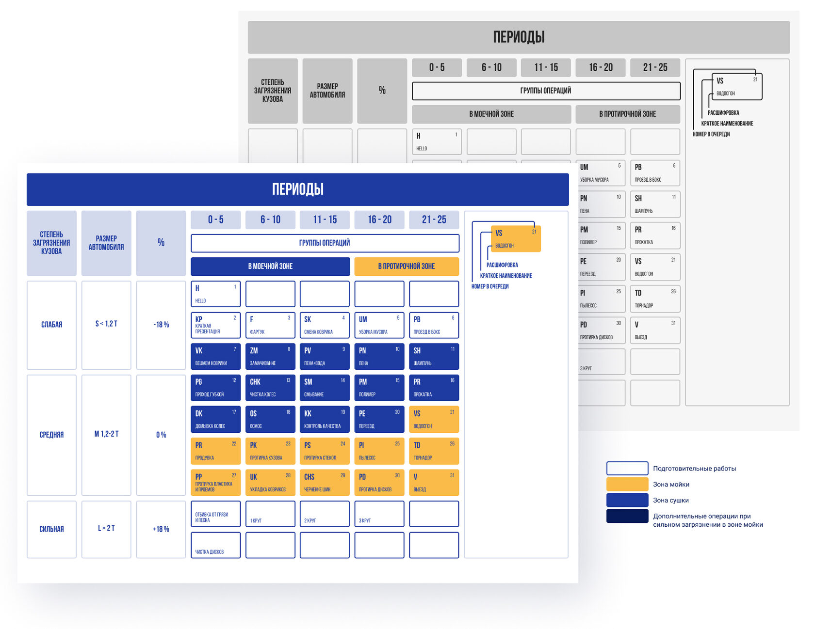 Мы разместили каждый из этапов в таблицу и цветами разделили зоны мойки. В плане визуальной наполненности ориентировались на фирменные цвета Аквастенда.