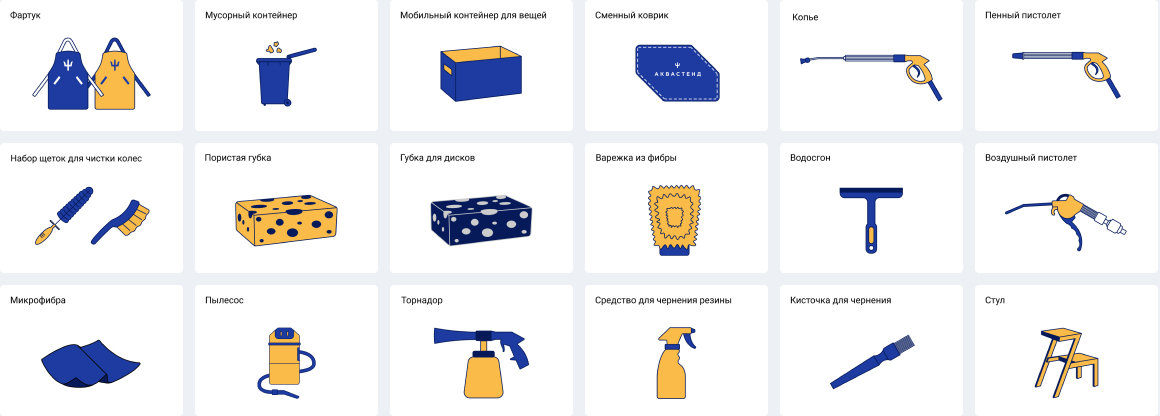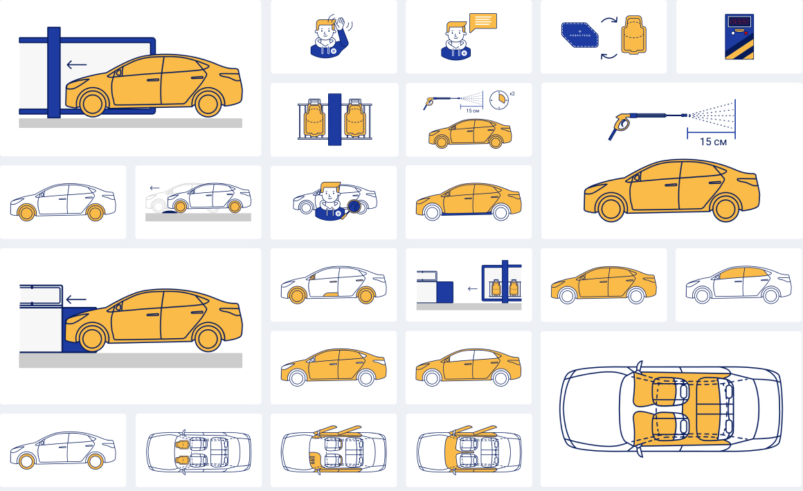 Мы создали уникальные иллюстрации инвентаря и автомобиля, на котором цветом выделили зоны мойки.
